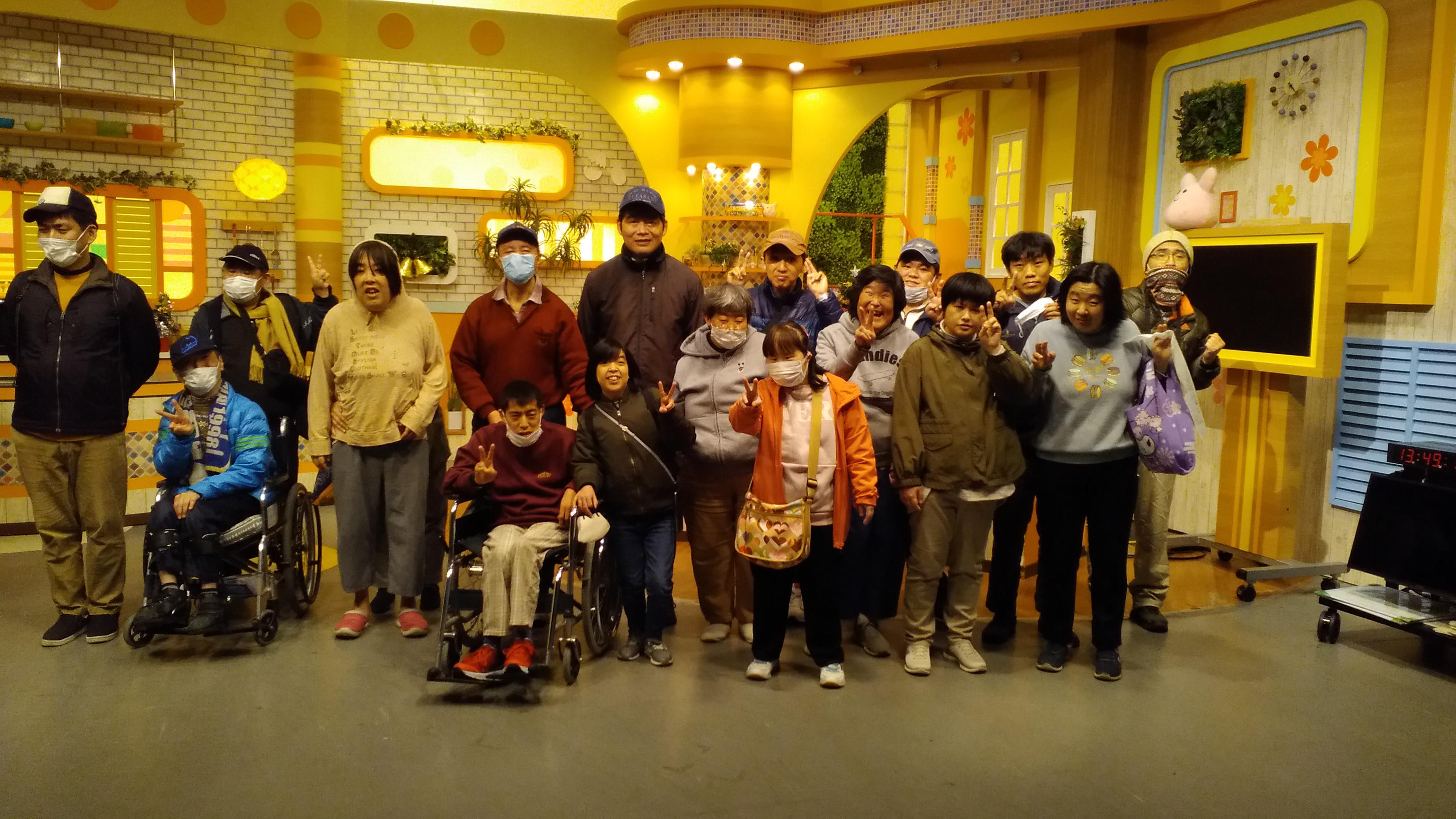 12月2日・3日の2日間、利用者の皆さんが3班に分かれてYBCメディアタワーを見学しました。ランチは各班ごとに好きなお店を選び、思い思いの昼食を楽しんだ後、YBCへ向かいました。ラジオ放送中のアナウンサーのいるスタジオを見学出来たり、テレビ番組「ピヨ卵ワイド」のスタジオを見学出来たりと、普段はなかなか体験できない貴重な楽しい時間を過ごすことができました。